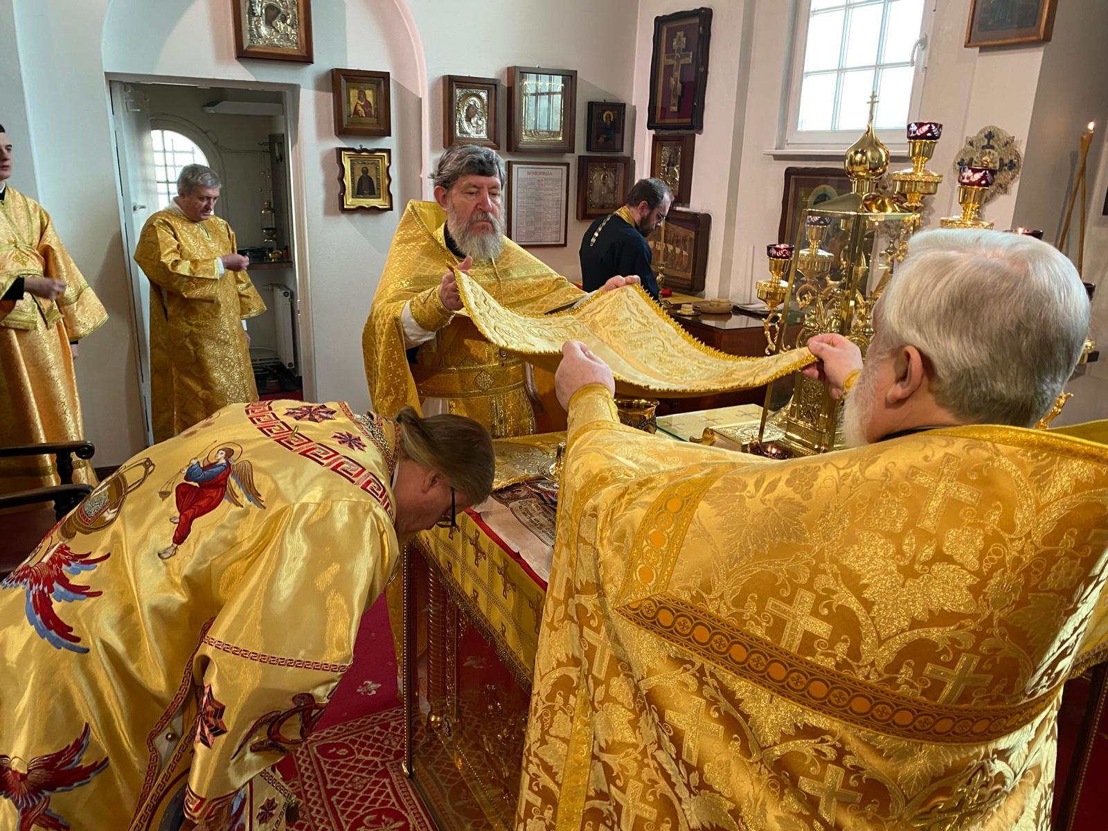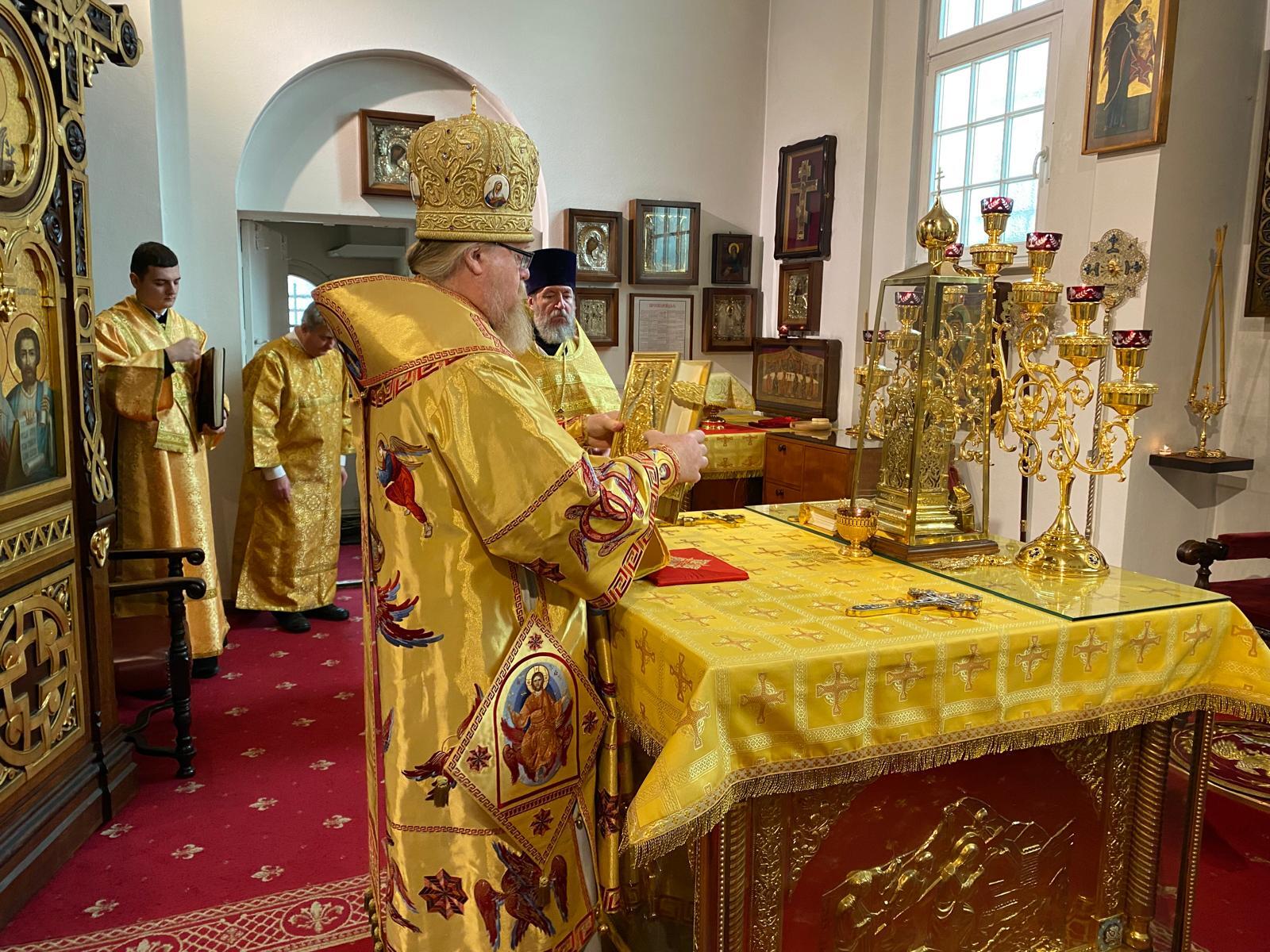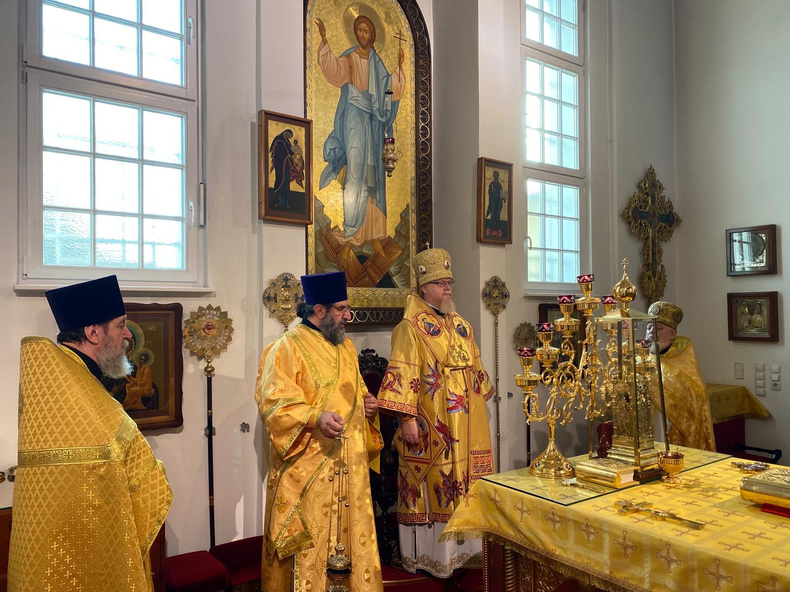 Его Высокопреосвященству сослужили благочинный Восточного округа протоиерей Георгий Антонюк, протоиерей Алексий Томюк (г. Лейпциг), протодиакон Арчил Чхиквадзе и диакон Ростислав Устименко.